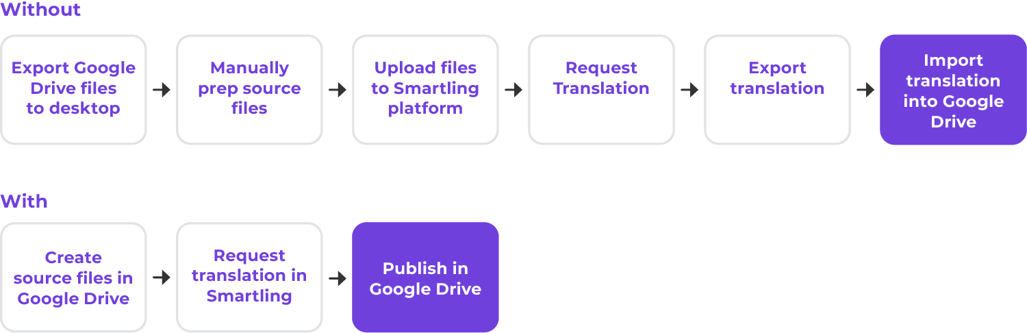 Smartling ti fa risparmiare innumerevoli ore di lavoro manuale, fornendo al contempo traduzioni di qualità superiore e un time-to-market più rapido. L'integrazione di Google Drive di Smartling ti consente di sincronizzare documenti di lunga durata da Google Docs alla piattaforma per la traduzione, tramite traduzione automatica o traduttori umani. Dopo la traduzione, i contenuti vengono inviati automaticamente e in modo sicuro alla cartella Drive di tua scelta.