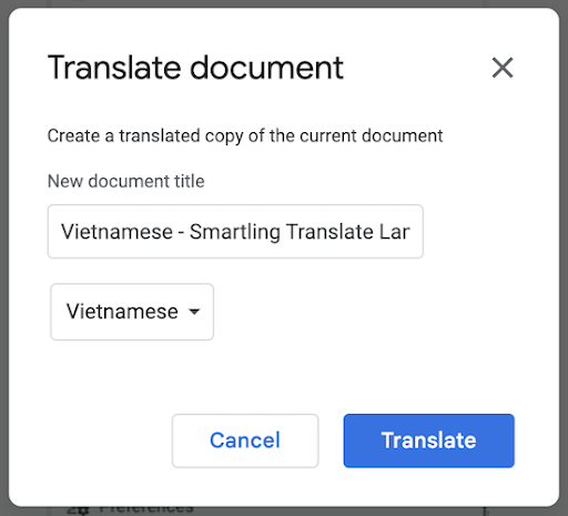 Si apre un popup in cui è possibile scegliere una lingua di destinazione e dare un titolo al documento tradotto. Il titolo predefinito è sempre "Copia tradotta di [nome documento]". È possibile specificare la lingua di destinazione nel nuovo titolo per organizzare i contenuti tradotti.